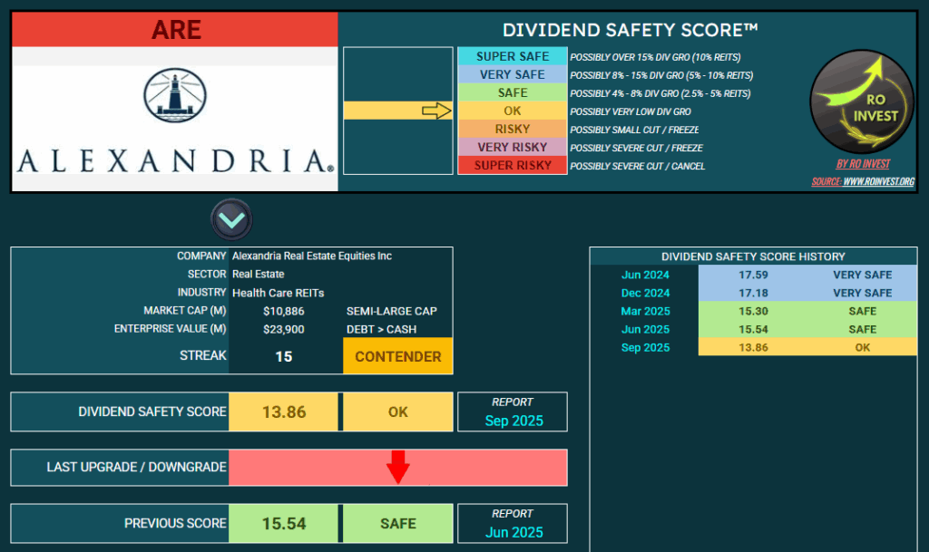 Scorul RO INVEST pentru siguranta dividendului (Dividend Safety Score) nu prezinta risc de taiere in urma actualizarii dupa raportarea din Q3, chiar daca totusi acesta a fost retrogradat de 2 ori in acest an, de la VERY SAFE la SAFE iar acum de la SAFE la OK. Mentionez ca ultimul downgrade NU a luat in considerare declaratia conducerii de mai sus ci e bazat doar pe evolutia companiei in acest an, si a industriei, atat din punct de vedere fundamental cat si financiar.