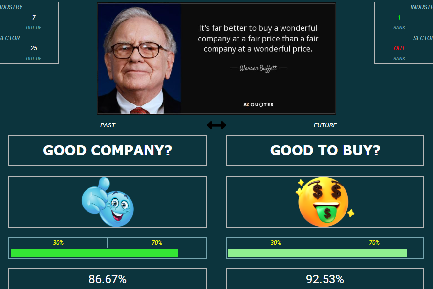 Inspirat de celebrul citat al lui Warren Buffett – „It’s far better to buy a wonderful company at a fair price than a fair company at a wonderful price” – acest instrument unic dezvoltat de RO INVEST îți arată dintr-o privire două lucruri esențiale: